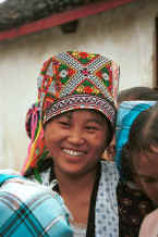 De Wo market(De Wo township is situated in Longlin County, Guangxi province, south west China. Side Comb Miao, with a population of around 4,000, are the majority ethnic group but there are other Miao groups living in villages around who may visit the 6 day market)These photos were taken in early October 2000 at the 6 day rotating market in De Wo township after a morning visit to Long Dong Side Comb Miao village. It was a very busy market full of traders and buyers which drew on a population from many villages around including from other townships. The predominate group were Side Comb Miao but a group of Flower Miao had been specially invited to come to the market to meet us and to sell us their textiles. They had come from their village in Zhu Chang township, 16km from De Wo and involving a 3 hour walk and a 5km bike ride. They were joined by Red Hat Miao and/or Clean Water Miao who had come from a village 8 km from De Wo involving a 1 1/2 hour walk. We also saw some White Miao. all text & images © Pamela A Cross