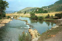 Shitou village(Shitou (meaning 'stone') village is a Bouyei village in Huanggousu township, Zhen Nin county, Guizhou province)These photos were taken at Shitou, or Stone village which was one of the first minority villages opened to tourists. It is near the significant tourist attraction of the Huanggousu Falls which attracts huge numbers of Chinese tourists although the Bouyei village is probably of more interest to foreigners. The village has beautifully constructed stone houses and is situated by a large stream running through the valley with mountains in the distance. At the village there is a stone bridge over the stream. We were fortunate to reach the village quite early in the morning whilst it was relatively peaceful and we were therefore able to enjoy the beauty of its situation. Old women were dressed in traditional dress and organised to sell textiles to the tourists. They were fairly tough but not too aggressive. all text & images © Pamela A Cross