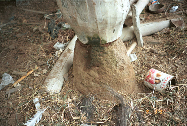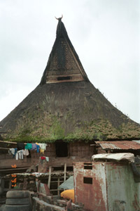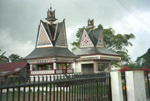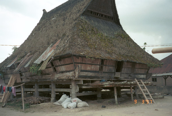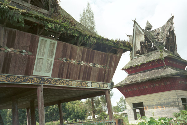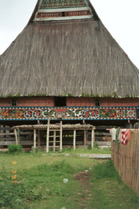 After lunch we set off down a long but interesting lane through Karo Batak farm land with hedges of hibiscus. There were old women walking along with uis gara (a term similar to the Toba Batak ulos) wrapped around their heads and wearing sarongs. The weaving for the uis gara is a wine/maroon with ikat. We eventually arrived at Barusjahe. There were several old houses although most were in poor repair and not inhabited. ... I saw a rice store and, next to it, a store for the bones of the first Barusjahe family ancestors. It was a very pleasant visit and interesting."
