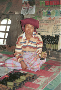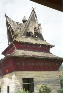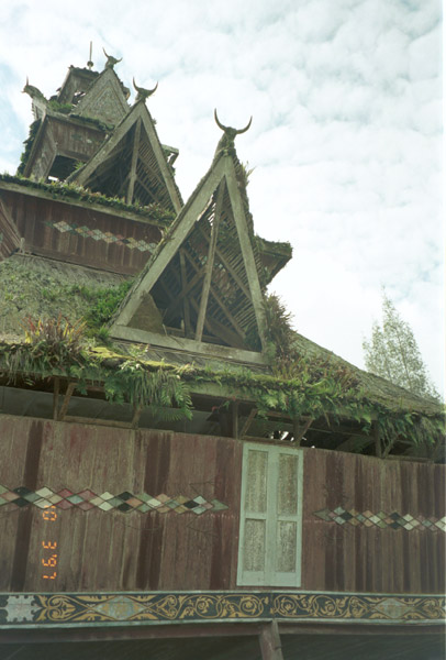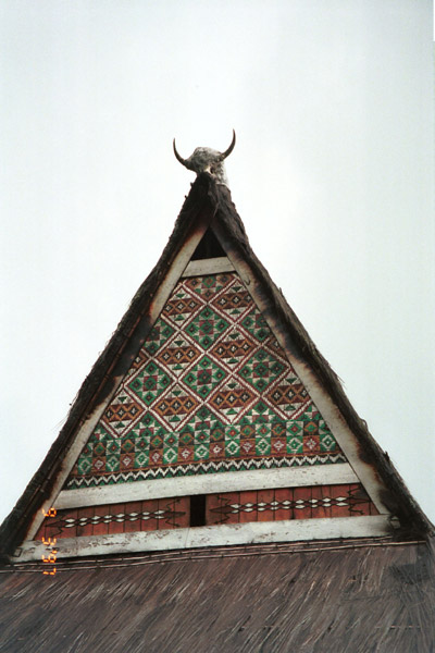 ...... Eventually, before going into Brastagi for lunch we went to the Karo Batak village of Lingga. I was shown around by a very nice Karo man (Ginting) who had been to Medan University and studied architecture. He had come back to the village and was working on restoring and maintaining the traditional Karo Batak houses. His grandfather had also been an architect. The lizard decoration on the wooden board on the houses is actually string tying the boards togther. The ‘legs’ of the houses sit on stone. Between the wood and stone is palm felt which acts as a shock absorber for earthquakes – of which they get many including one the previous week which had meaured 6 on the Richter scale. No nails were used in building the houses. The five colours of painted designs on the houses represent the five sub-tribes of the Karo Batak. The Karo cannot marry within the same group. (Ginting was blue.) There is a separate house where young men have to sleep after they are 17 years old and must leave the main house.
